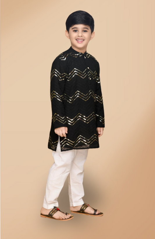 Boys Yellow & Gold Printed Festive Kurta White Pyjama