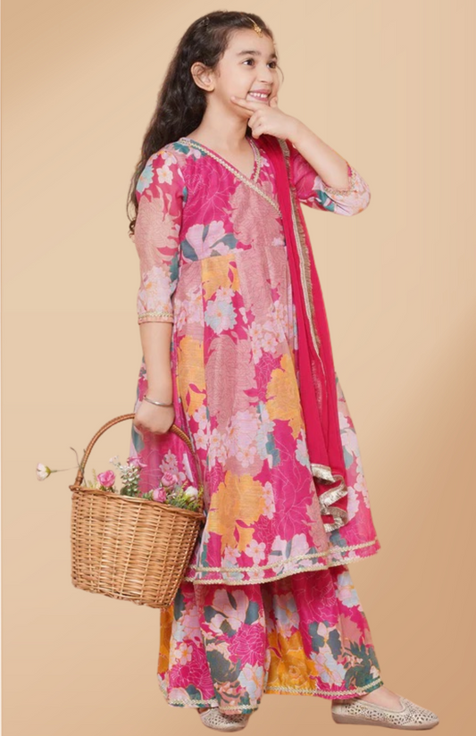 Girls Pink Multi Floral Printed Angrakha Gotta Patti Kurta & Sharara, dupatta Ethnic Traditional Dress