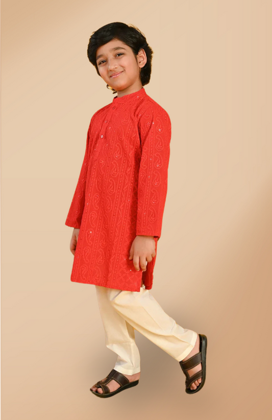 Boys Red Embroidered Pajama Kurta Ethnic wear