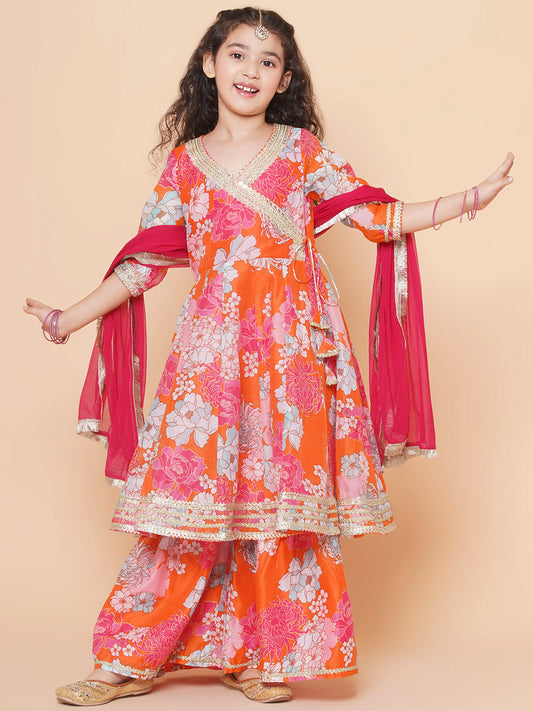 Girls Orange Multi Floral Printed Angrakha Gotta Patti Kurta & Sharara With Dupatta