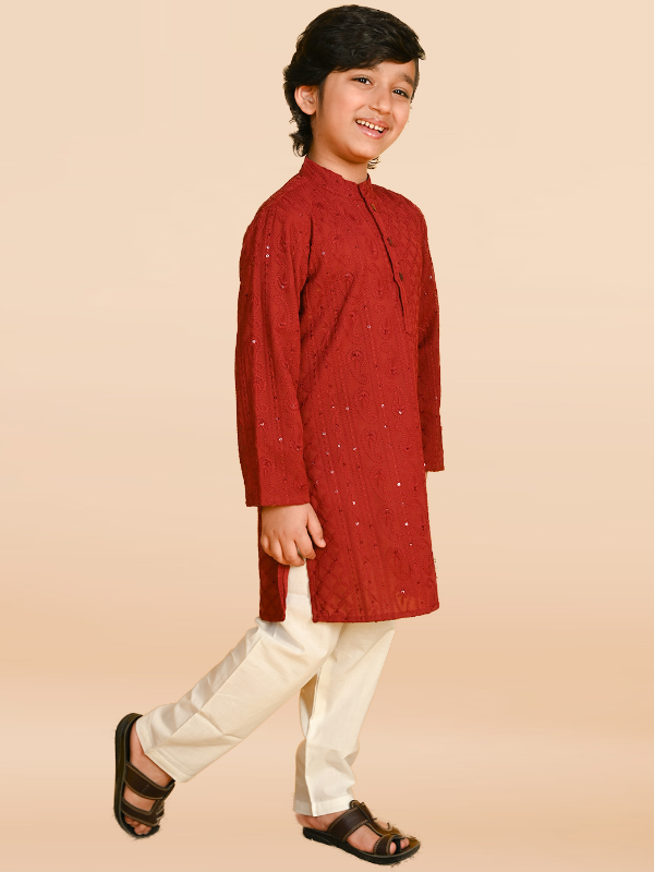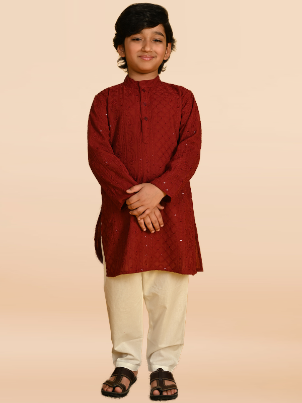 Dress your young gentleman in the sophisticated style of our Boys Maroon Embroidered Kurta With Pajama Ethnic Wear. Order now and let him make a stylish statement at every celebration!